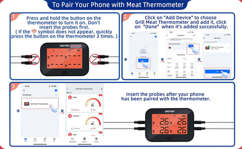 - Please make sure that the probes are inserted firmly into the Bluetooth meat thermometer after the meat thermometer has been paired with the phone.