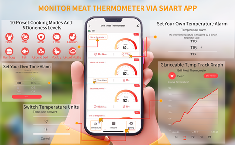 The alarm will be triggered when the food temperature reaches your preset temperature or when a timed reminder is reached. No need to worry about overcook or undercook with the cooking thermometer.