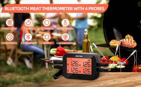 DIGITEN MTB-4P food thermometer equipped with 5.0 Bluetooth technology, supports you monitor your food from up to 394ft away by smart app. The grilling thermometer comes with 4 waterproof probes that can be used to read 4 types of food at once, features temperature and timer alarms allow you set a temperature range and timer for each probe, making the thermometer extremely convenient.