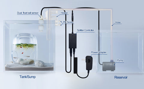 The ATO system uses a double float water level switch (like "two eyes") to double monitor and protect the fish tank water level.