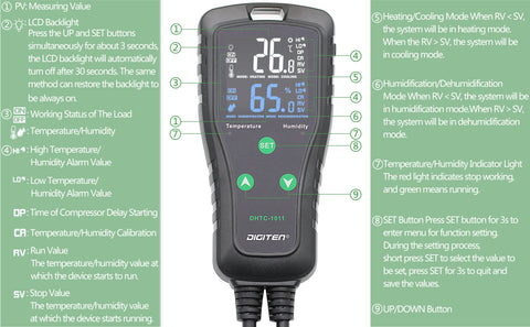 - 🍄【Wide Control Range】Temperature and humidity 2 in 1 sensor; temperature control range is -40℉~248℉, humidity control range is 1%RH~100%RH. It starts cooling or heating, humidifying or dehumidifying according to configured parameters, which helps to keep a desired temperature and humidity anytime.