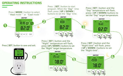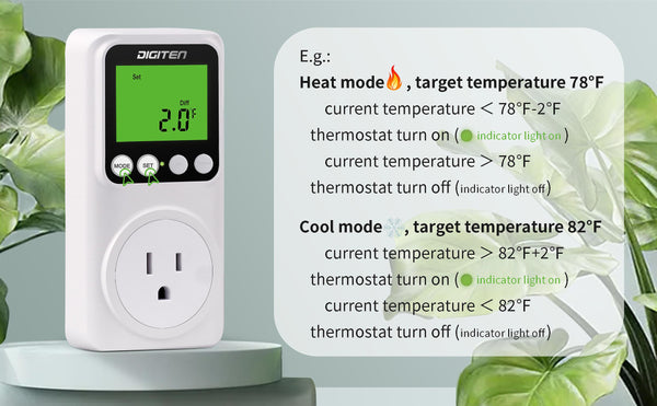 The timer thermostat outlet can monitor heating or cooling equipment according to the mode you select, and target temperature and day/night time you set. The timing temperature controller can realize day and night temperature control, which is more suitable for the physiological needs of animals and plants.
