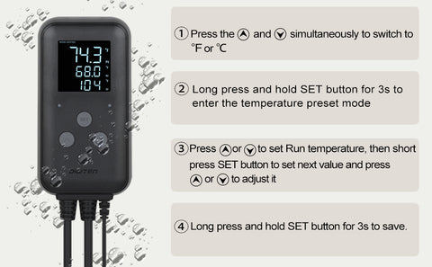 - DIGITEN waterproof thermostat can also be used with aquarium heaters. Simply put the sensor in the water and set it within the temperature range of the fish's natural habitat to provide a comfortable environment for them.